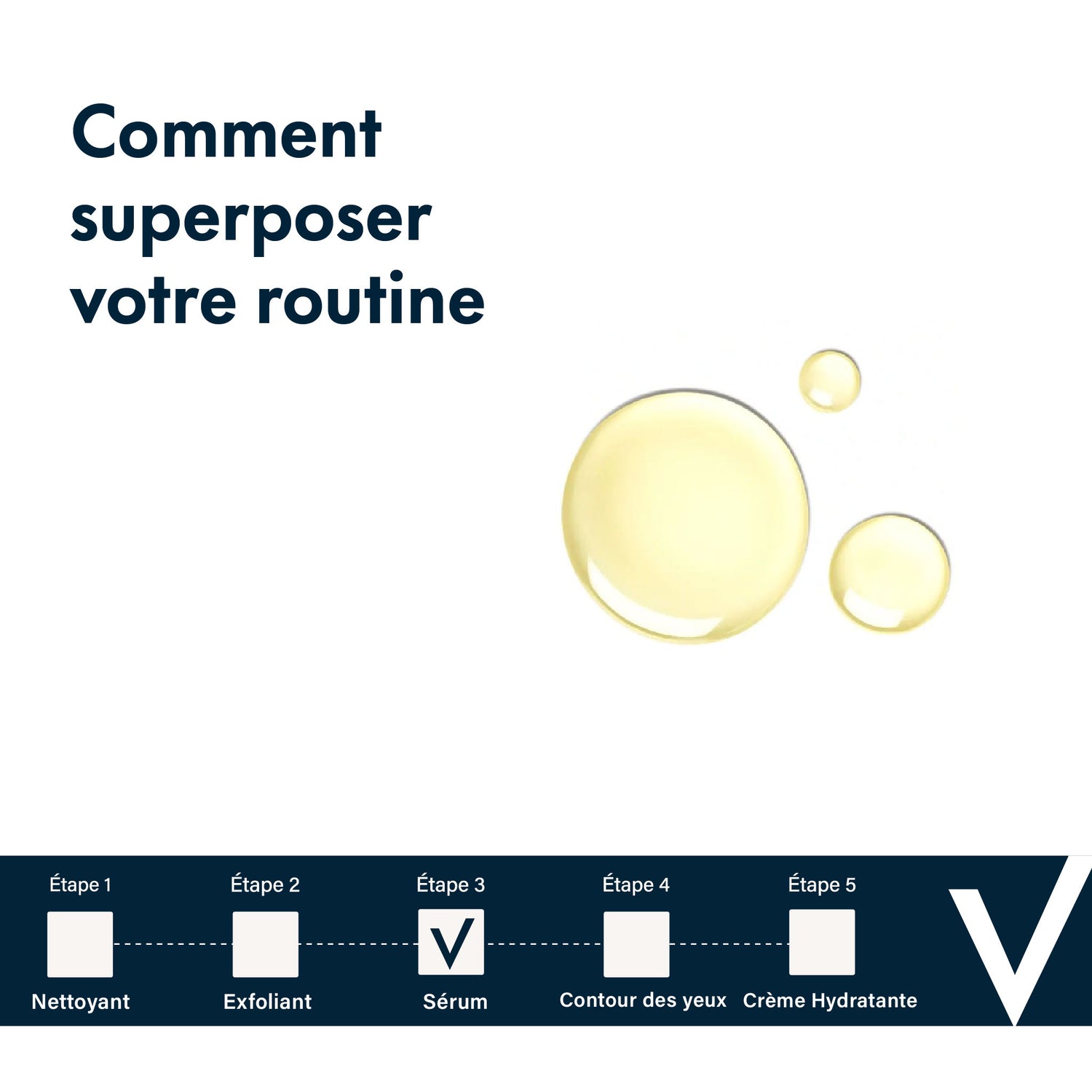 Après le nettoyage, lors de l'étape 3 : sérum, appliquez quelques gouttes sur la peau. Utilisez le bout des doigts pour masser délicatement le sérum et le faire absorber, en commençant par l'intérieur du visage et en allant vers les contours.